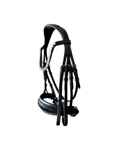 - Muserola ancha y de suave acolchado, destacando el charol imitación en piel de serpiente en tonalidades negro, azul y verde. Ancho muserola: 5 cm.
