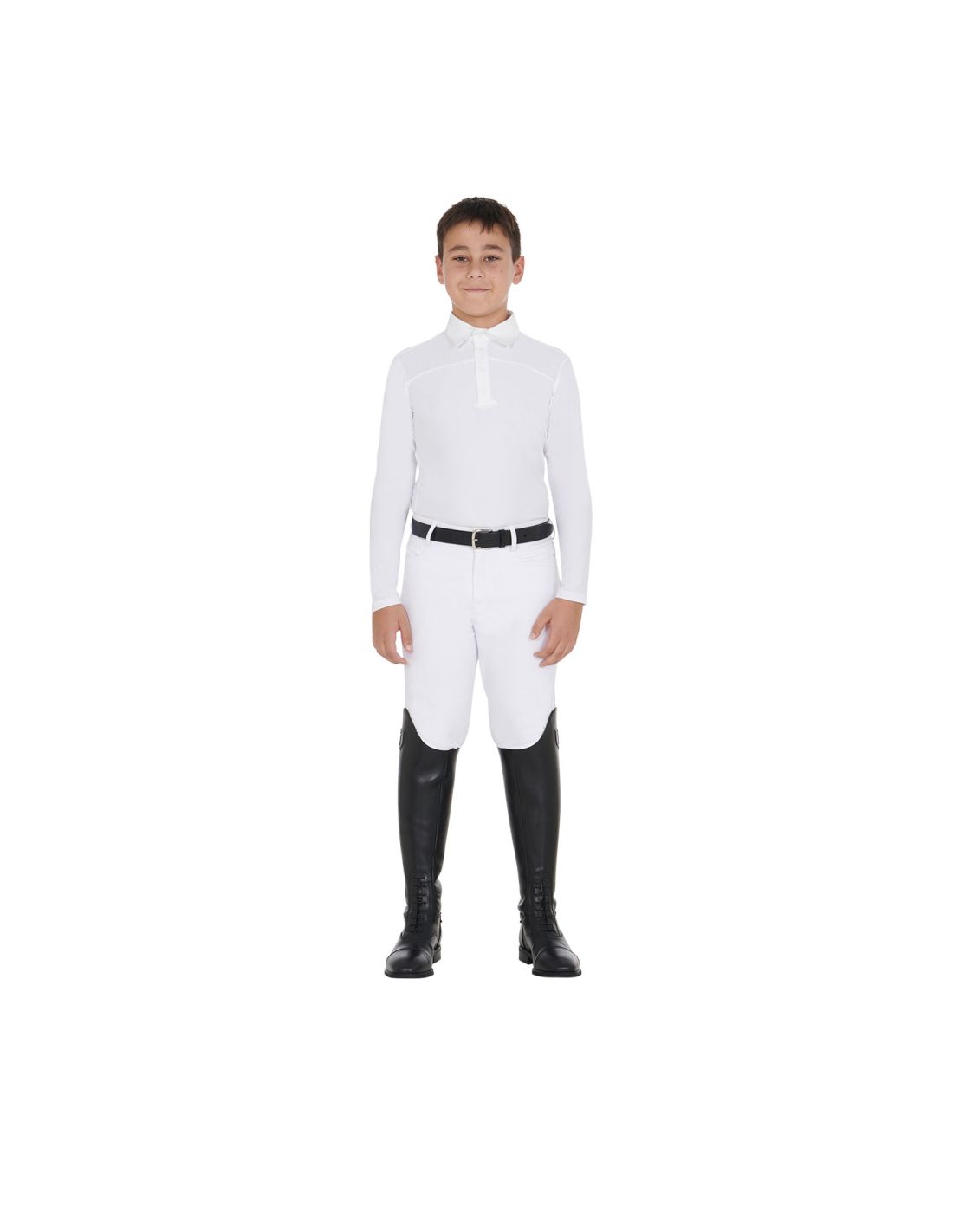 Polo de manga larga con botones para niño, polo de competición para niño de corte entallado y manga larga confeccionado en tejido técnico que garantiza un excelente confort y portabilidad. El corte anatómico hace que la prenda sea elegante, pero a la vez cómoda y práctica. Este tejido particular, aunque es transpirable, es adecuado para su uso en los días más fríos. Viene con un cierre de tres botones y cuello abotonado con el logo de Equestro bordado tono sobre tono en el hombro izquierdo.