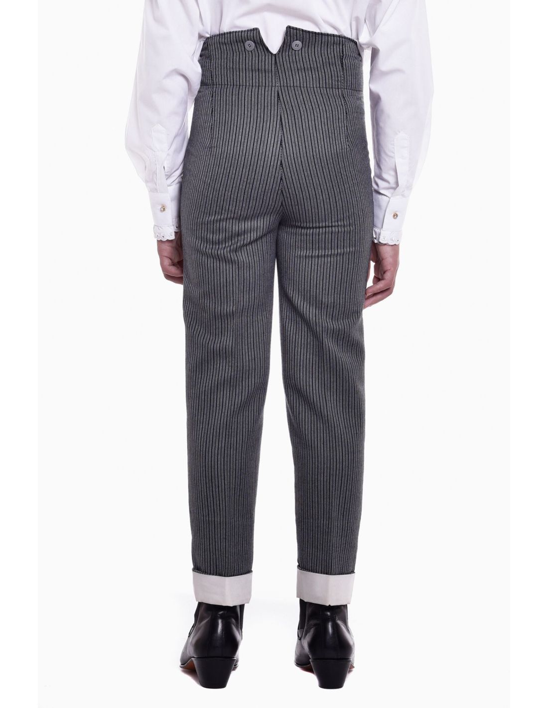 Calzona Vuelta Raya Niña, calzona clásica de sarga rayas con vuelta blanca/cruda, sin forrar. Botones externos para tirantes. Muy combinable. Adecuada con chaquetas camperas. Para la correcta indumentaria a la hora de montar, si se viste la calzona de vuelta se deberá llevar el boto de caña alta y el zahón, mientras que con la calzona de caireles se deberá llevar el botín corto y la polaina.