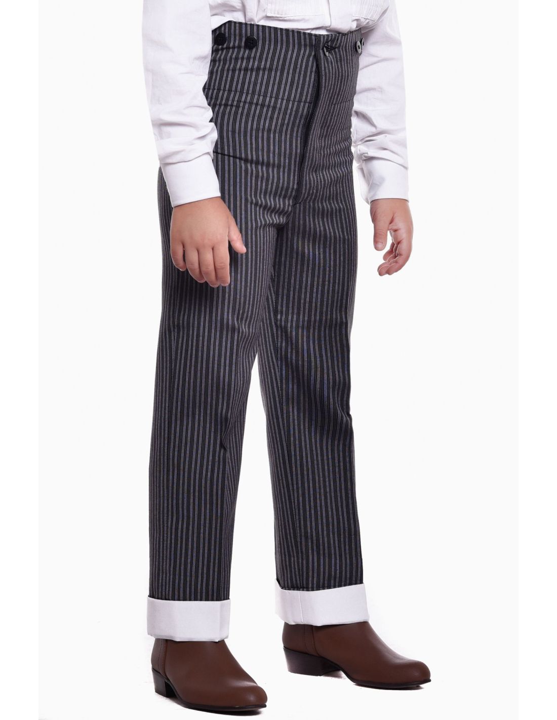 Calzona Vuelta J&P Raya Sin Forrar Traje Corto Niña, calzona de tejido 100% poliéster con vuelta blanca/cruda, sin forrar. Botones externos para tirantes. Adecuada con chaquetas camperas. Tejido fino y resistente. Muy combinable. A la hora de la toma de medidas de calzonas, aconsejamos pedir una talla más en tejidos no elásticos.