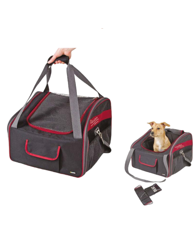 Perro Bolsa Transportín, bolsa de transporte para perro. Se utiliza a modo de bolsa gracias a sus asas regulables y también se puede utilizar en el asiento del coche enganchando el asa en el reposacabezas. Fabricado en nylon flexible y lavable, con correas ajustables, se fija a través de la apertura lateral. Lleva bolsillos laterales, con ramplones de goma para una mejor retención al suelo.